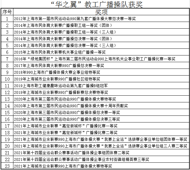 华江小学还有一支明星队伍哦,那就是被誉为“冠军收割机”的华之翼教工广播操队。他们凭借着刻苦的训练和坚持不懈的努力,在十年间获得市、区各项广播操比赛的特等奖、一等奖20余次,更是两次代表上海踏上全国的赛事。在去年的第十四届全运会上,获得了银牌的好成绩。“华之翼”教工广播操队曾多次被电视、电台、报刊等各类媒体报道,在教师榜样的引领下,华小的学生广播操队也一直是市级比赛的佼佼者。